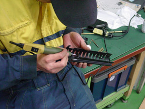 チュィ〜〜〜〜〜ン! 火花が飛び散ってますねぇ〜 ベビーサンダーにて加工中〜〜。 ちなみに・・・現時点では、まだ2人共 「本当に出来るかなぁ。。。。」 って、感じですね。(笑) まったく、先が見えません。 とにかく、目の前の問題をクリアして行く。 |