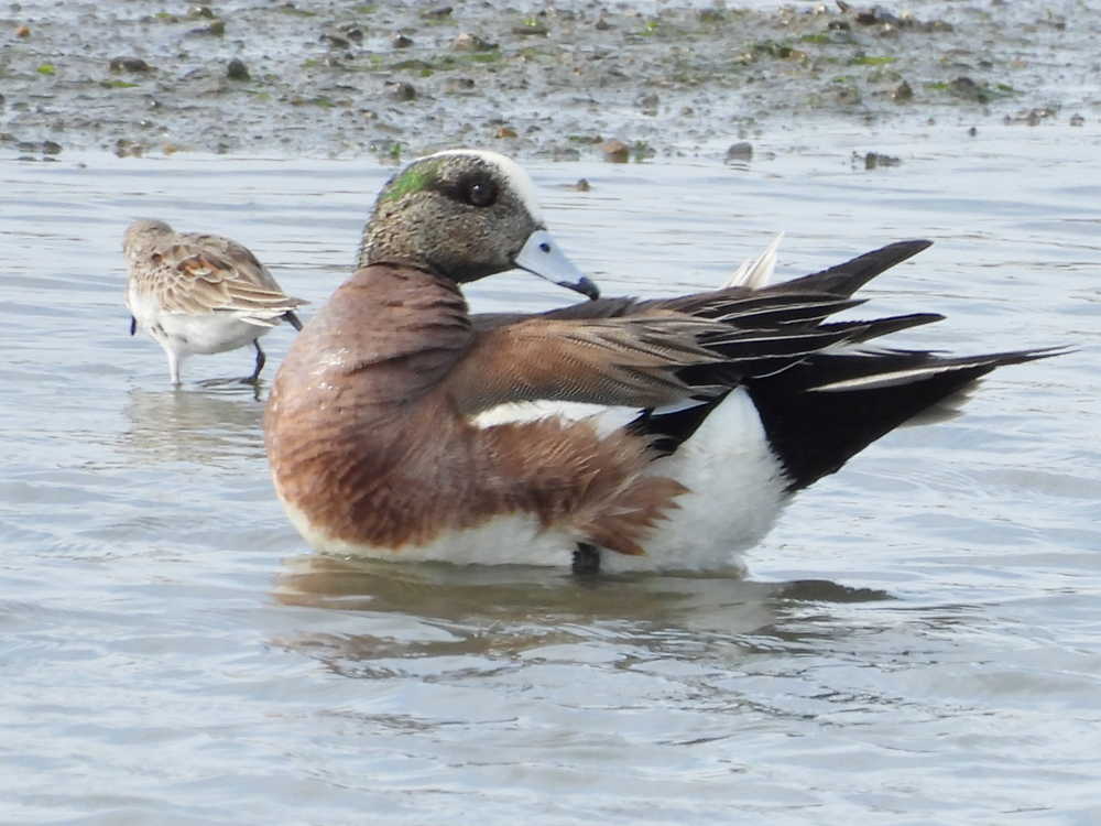 中州のハマシギを見ていると、羽繕いをしているアメリカヒドリを見つけました。