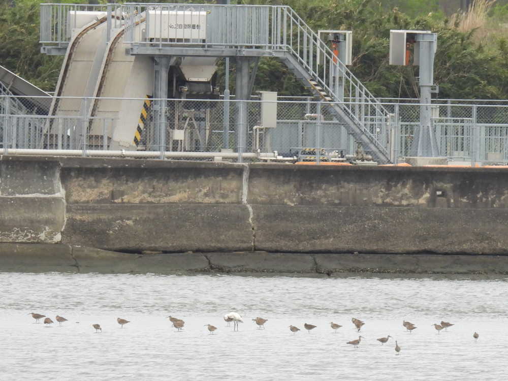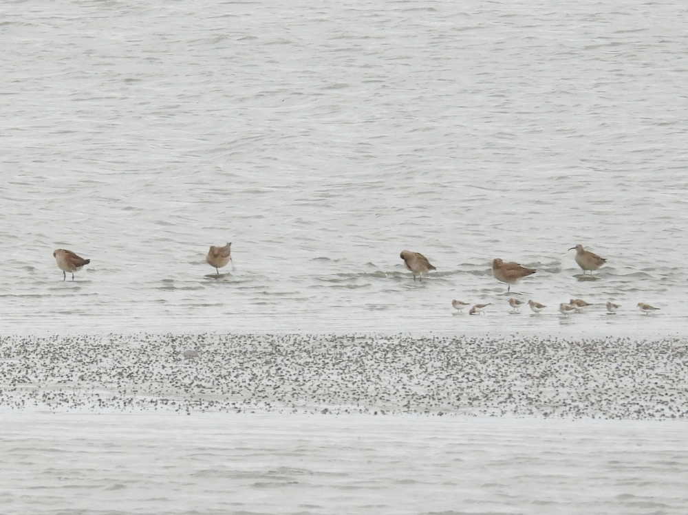 干潟がこれから広がっていく時間帯で、対岸のあたりにチュウシャクシギ30羽が集まっていました。