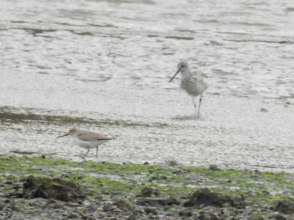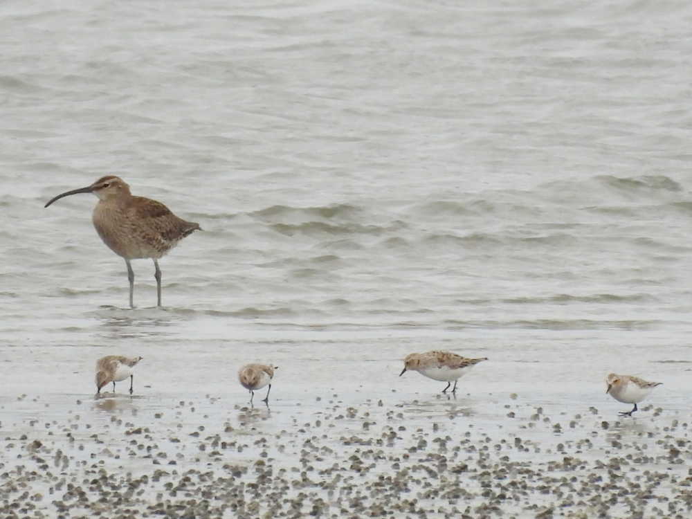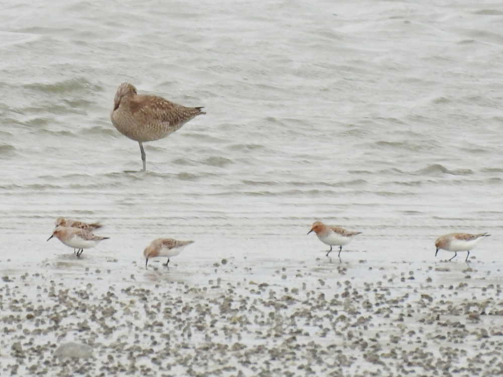 チュウシャクシギの足下でトウネン9羽の群れがお食事中でした。