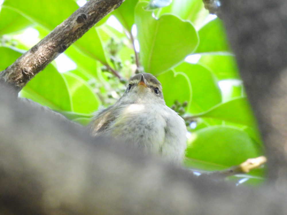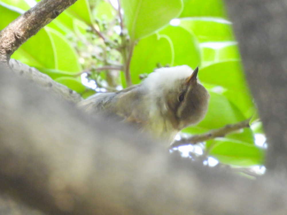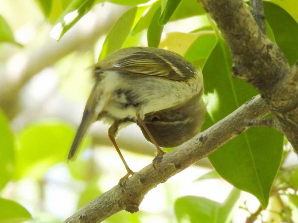 また会えたムシクイの仲間は疲れたのか、太い枝の向こう側で羽繕いを始めました。