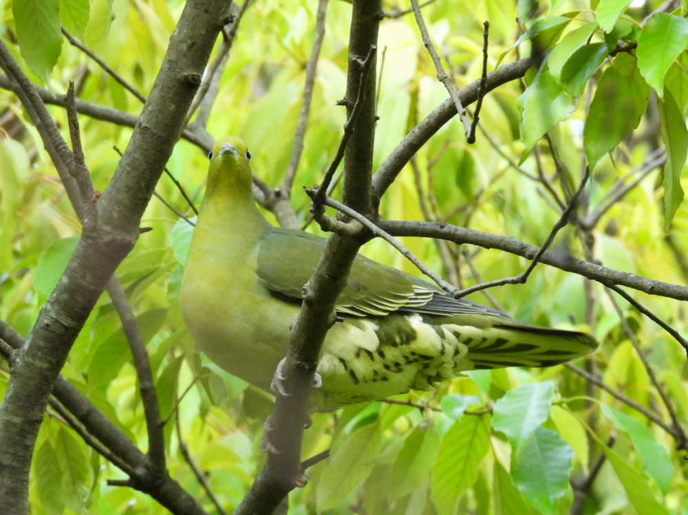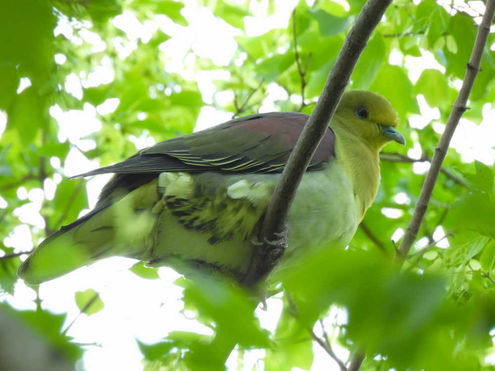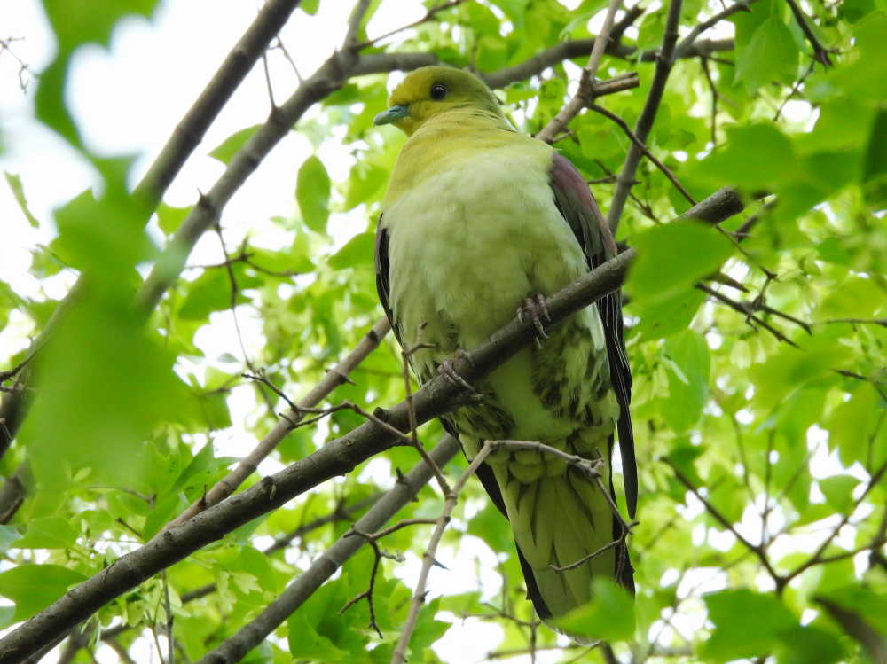 水場の近くに行ってみると、高い木の枝にアオバトのオスが1羽とまっていました。