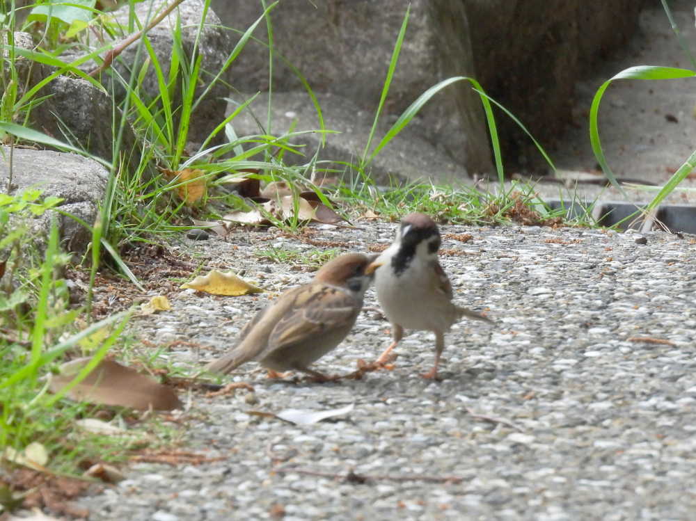 スズメの親子が地面に下りていて、餌を集めた親が子供に近づくと、