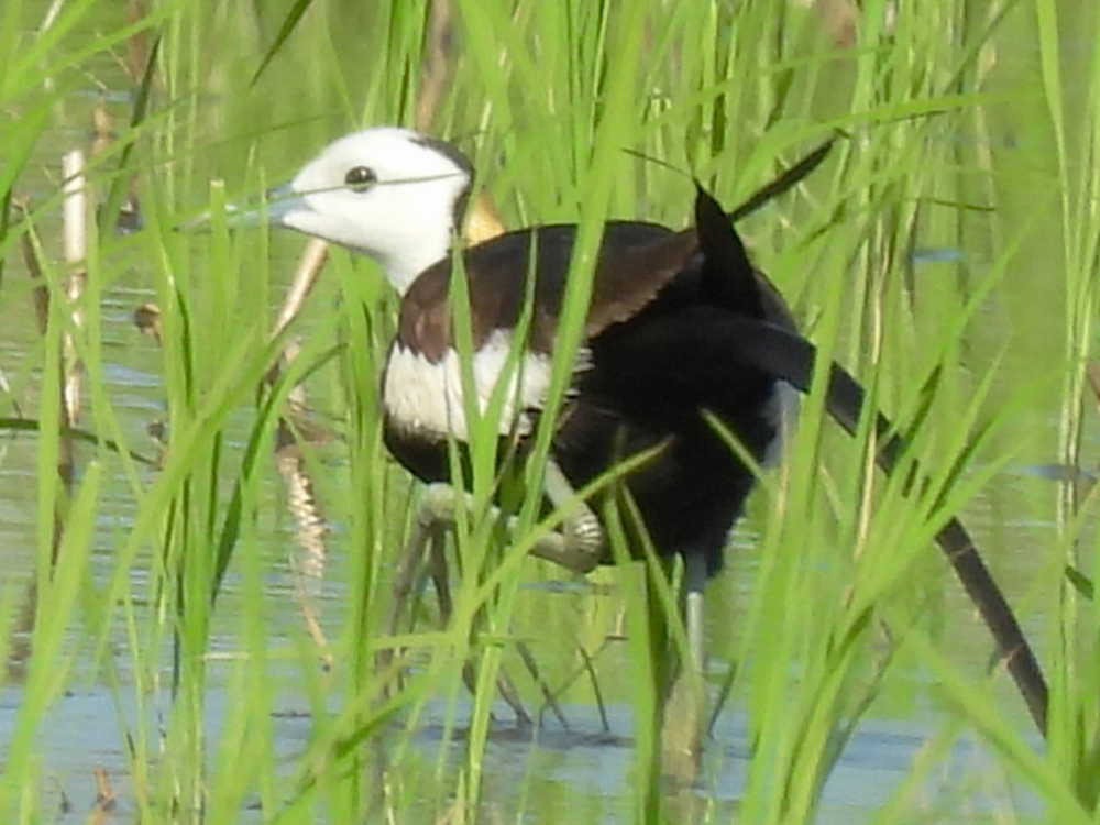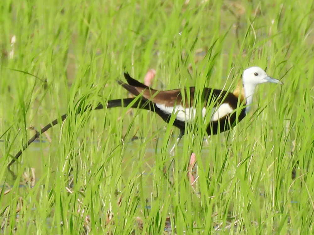 池巡りの途中、前方の水田で、尾が長い大きなハクセキレイみたいな子がお食事しているのが見えました。
