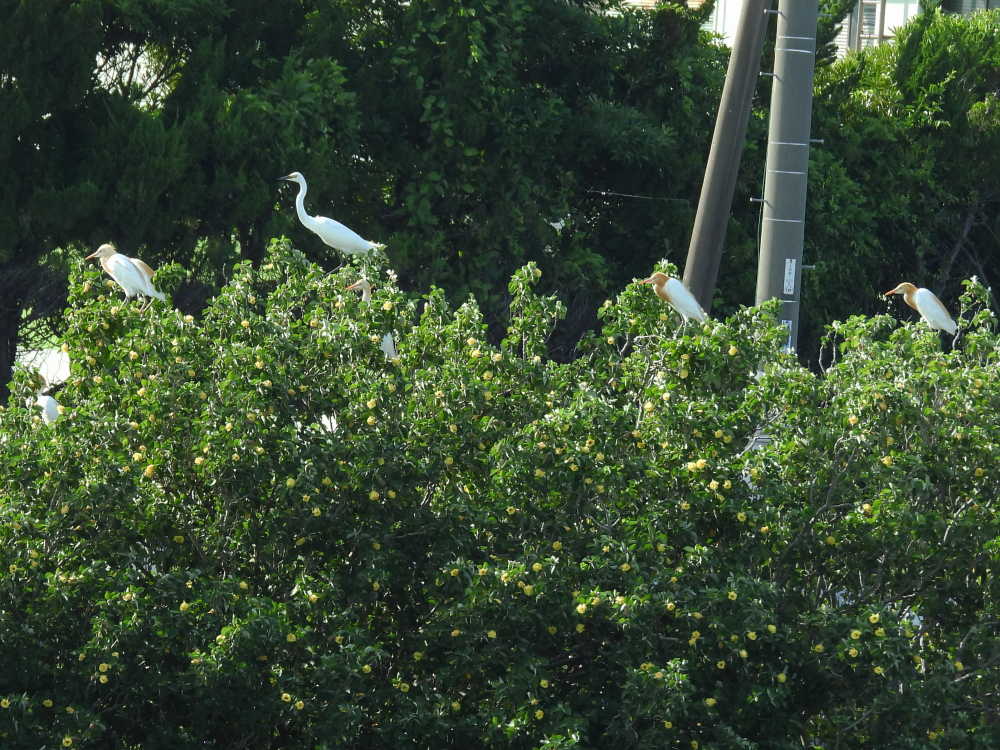 サギが8羽が飛んできて、中州のハマボウの木の上にとまりました。