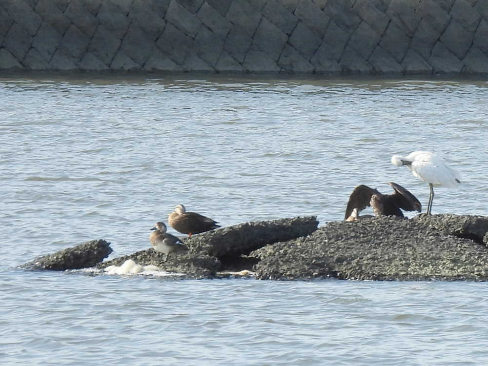 ホシハジロのメス?、カルガモ、カワウ、クロツラヘラサギ