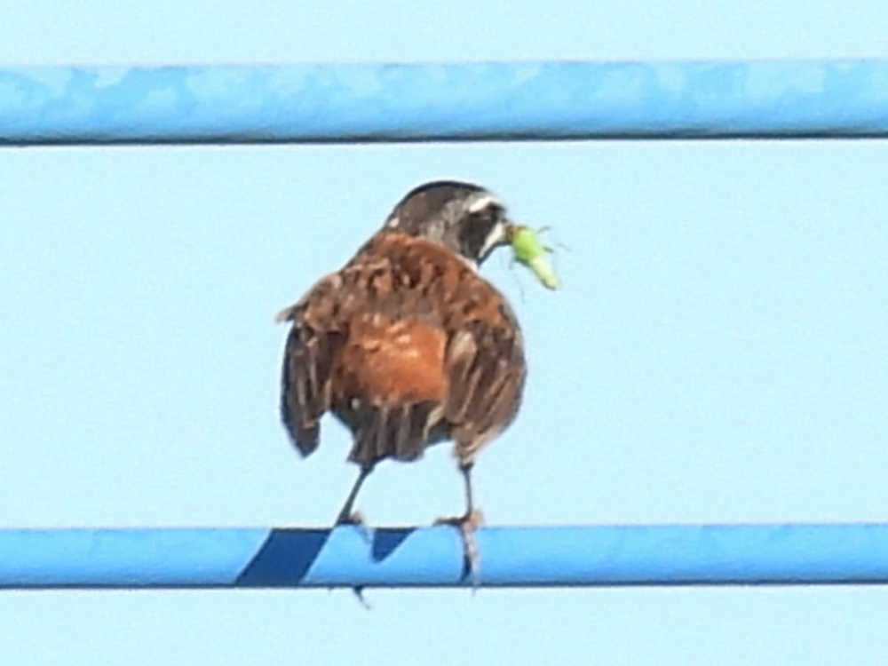 電線にとまっていたホオジロはバッタを捕まえていました。