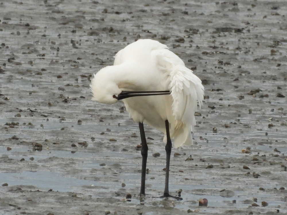 クロツラヘラサギは水の中ではなく、干潟の上で餌を探していました。