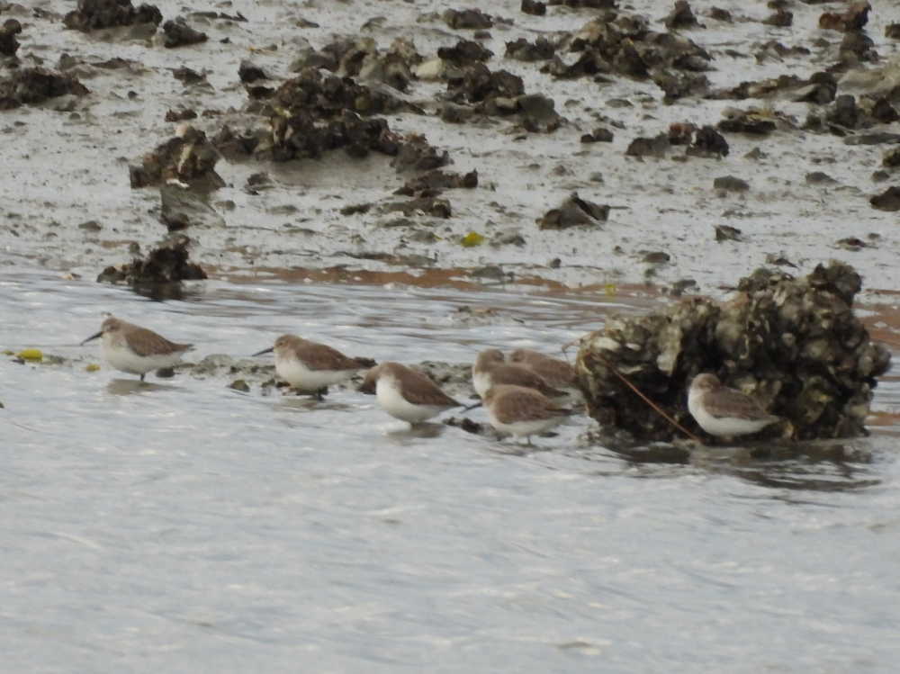 ハマシギはどこにいるのかと探していると、もう少し上流の水際に並んでいました。
