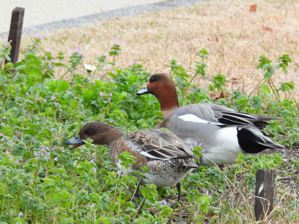 その間に、私の足元からヒドリガモ2羽が岸に上がり、水路を飛び越えて、