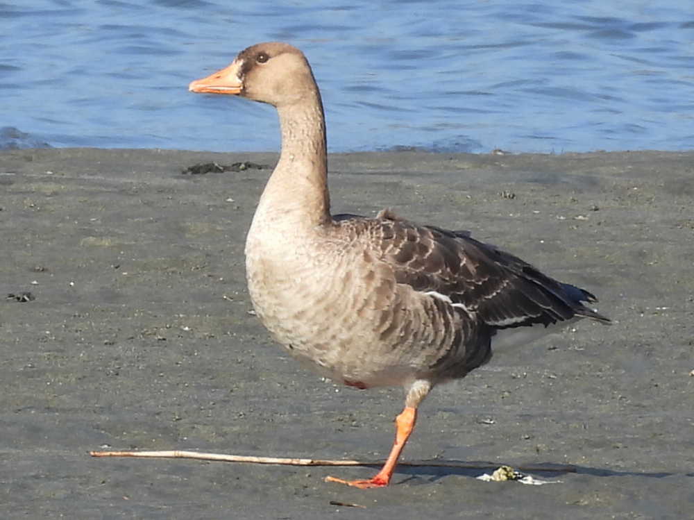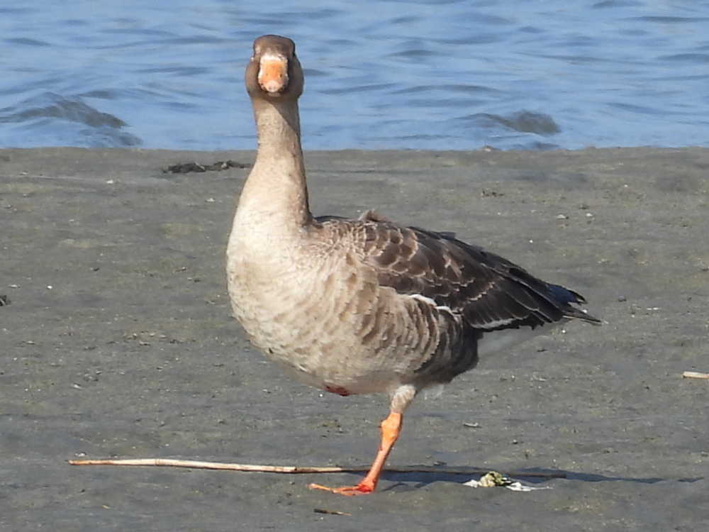近くで寝ていたカルガモが中州の砂の上に移動すると、