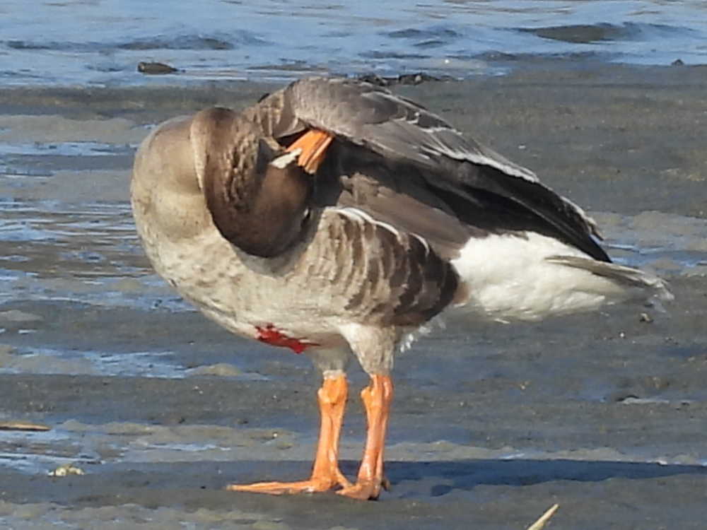 マガンは片足立ちをよくするので、このときに足をお腹に隠したときに血が付いたのかもしれません。