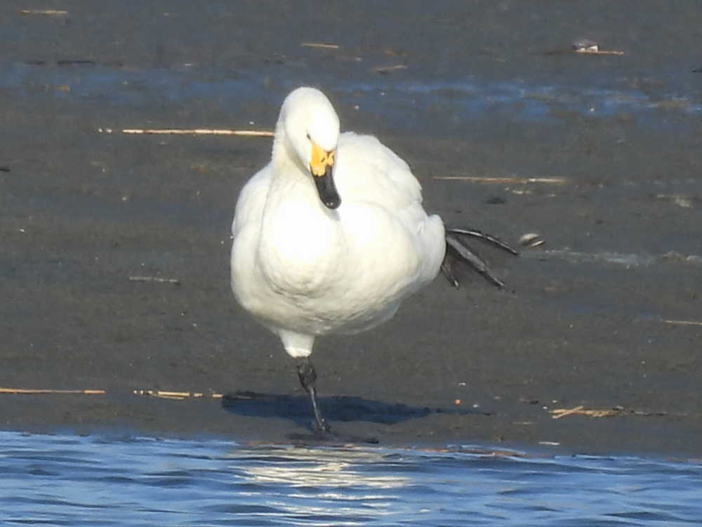 コハクチョウのいたところに戻ると、コハクチョウは陸に上がって羽繕いをしていました。