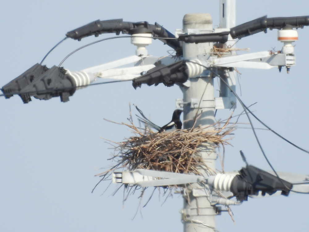 今年も電柱の上に巣を作っているカササギがいました。