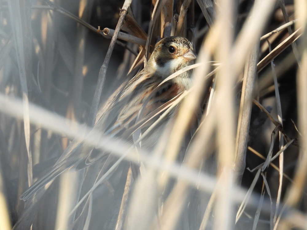 二つ池を見ていると、池の畔の葦原にオオジュリンが1羽飛んできました。