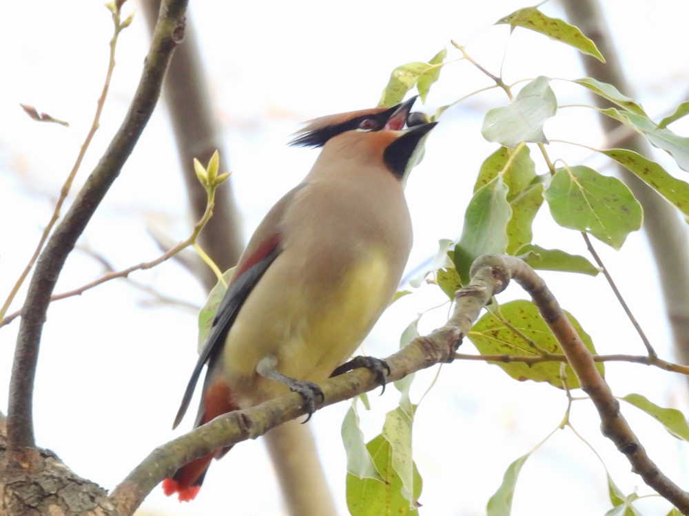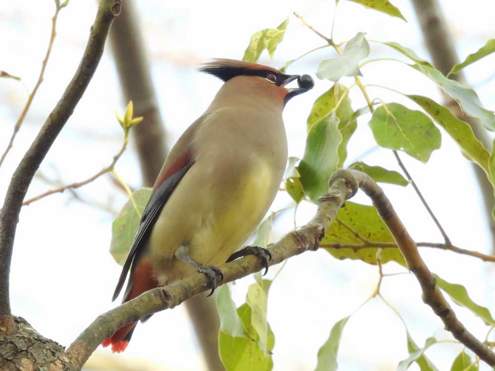 木の上を見ると、ヒレンジャクが木の実を食べていました。