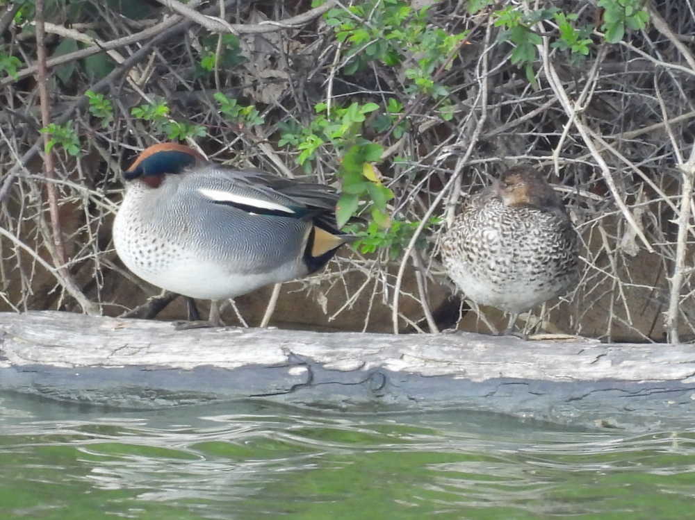 二つ池の東側の池では奥の岸でコガモのペア3組が休んでいました。