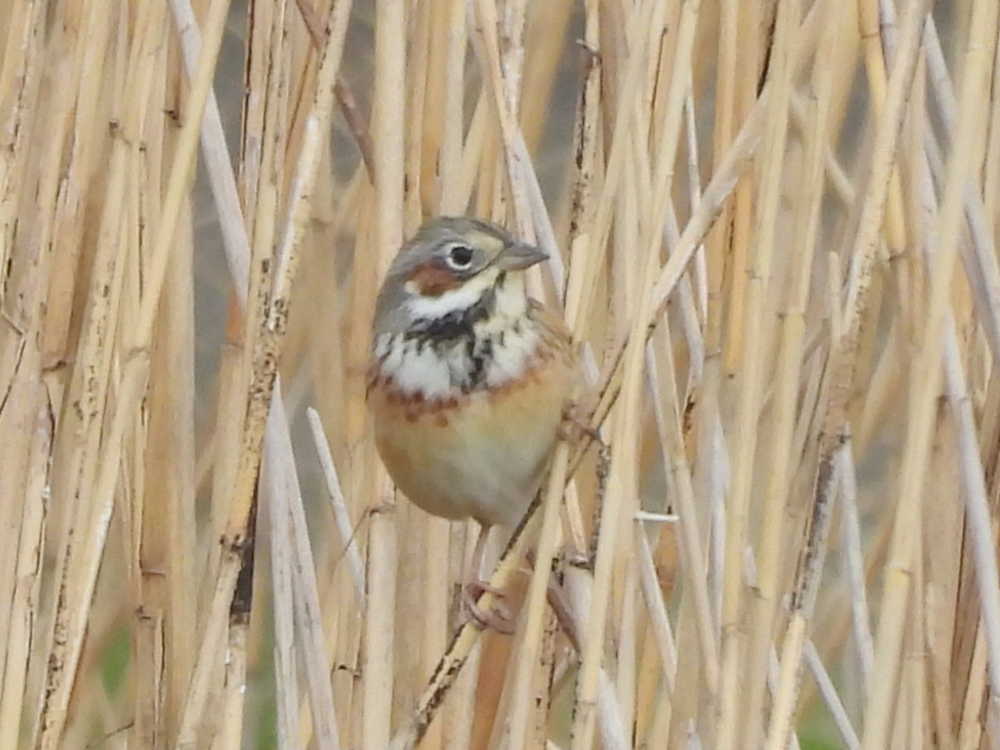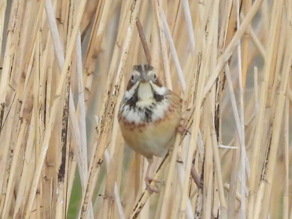 玄洋高校の裏手の葦原に動く気配を感じて見てみると、葦にホオアカがとまっていました。