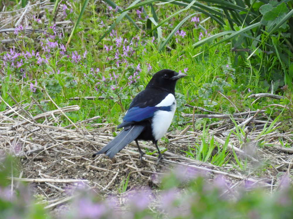 いつも仲良く2羽で行動しているカササギですが、今日は地面でお食事中でした。