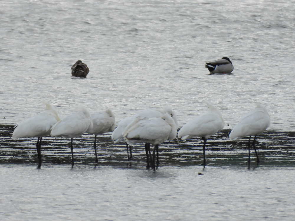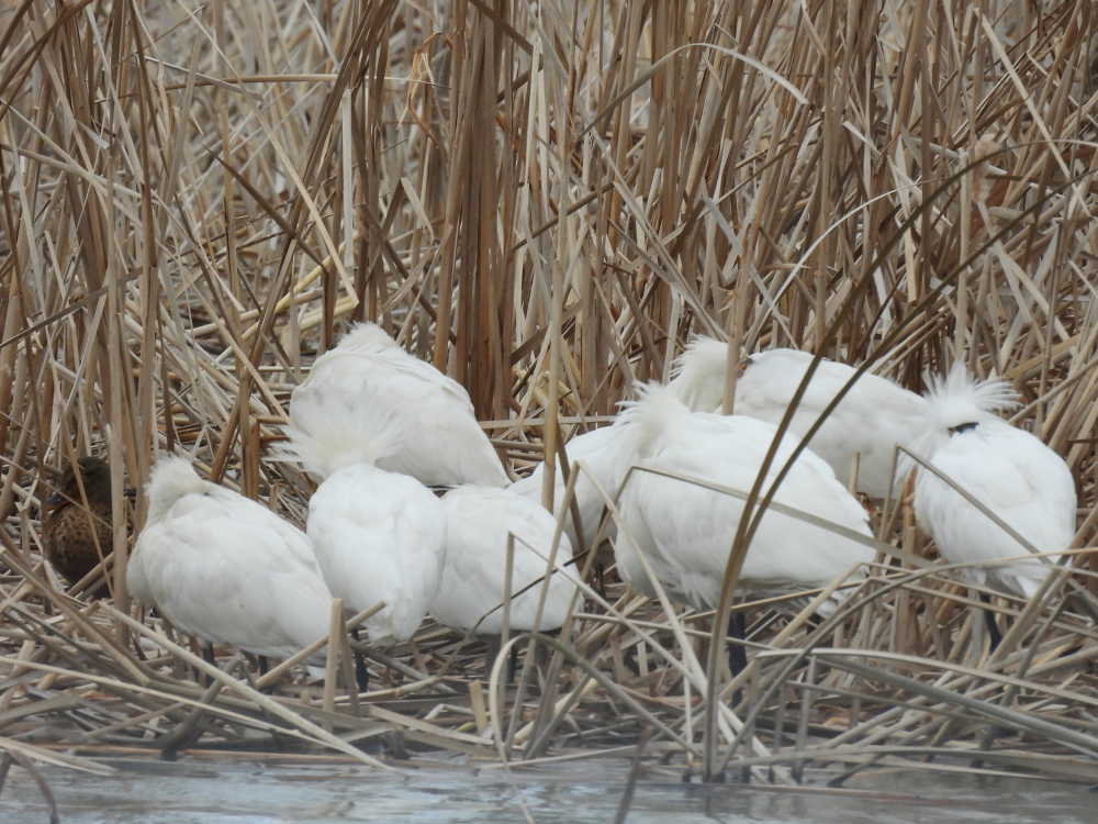 二つ池の西側の池の葦原の中ではヘラサギの仲間の群れが休んでいました。