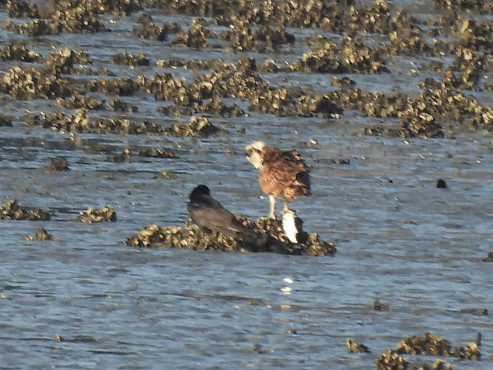 お魚を捕まえたミサゴとカラスの仲間の1対1のバトルが始まっていました。