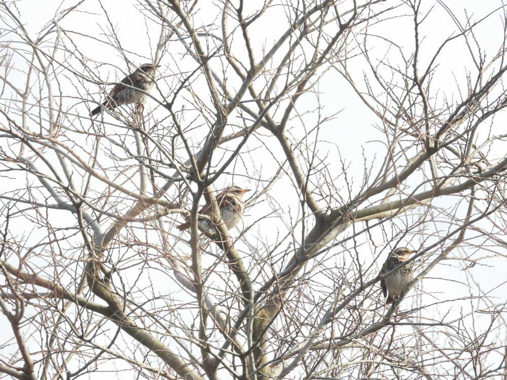 二つ池の北の水路を歩いていると、高い木の上にツグミ3羽を見つけました。