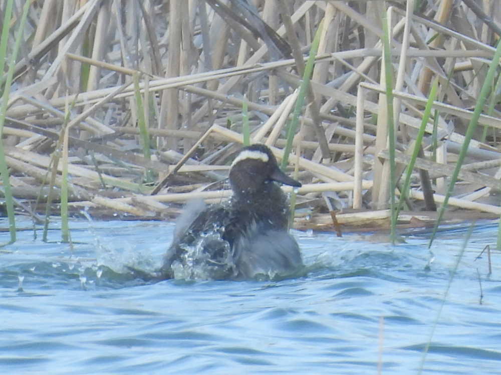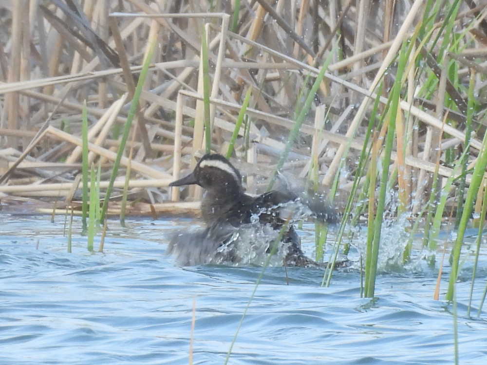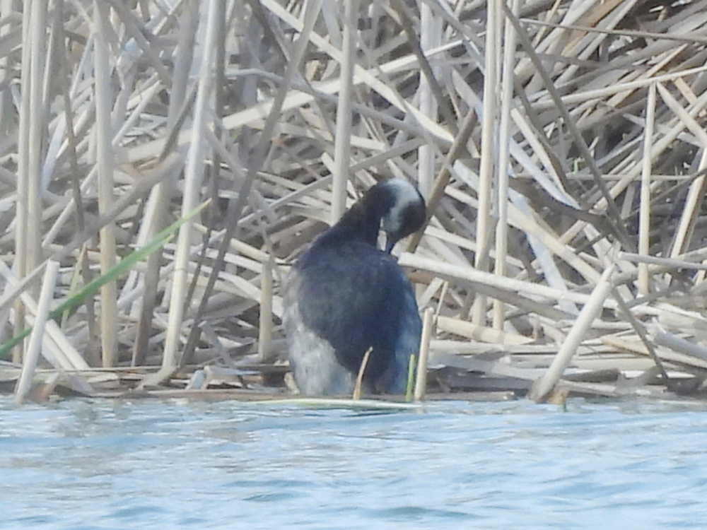 シマアジの横を見ると、ハジロカイツブリも水から上がって羽繕いをしていました。