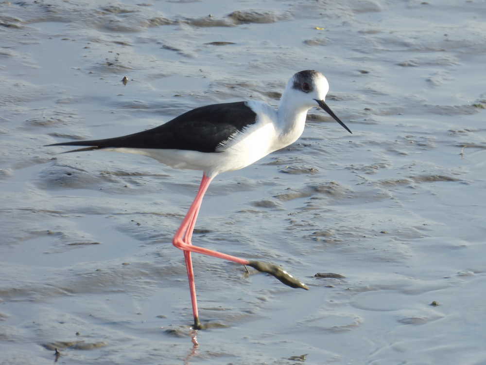 周船寺川も半分くらい干潟が出ていて、セイタカシギがお食事中でした。